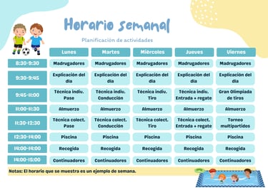Descubre cómo organizamos cada jornada: entrenamientos, juegos, piscina, descanso y muchas sorpresas para vivir un verano inolvidable.